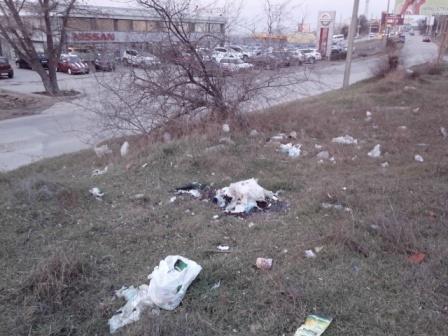 Напротив автосалона Ниссан, на склоне у дороги валяется мусор, наверное его набросали из машин.