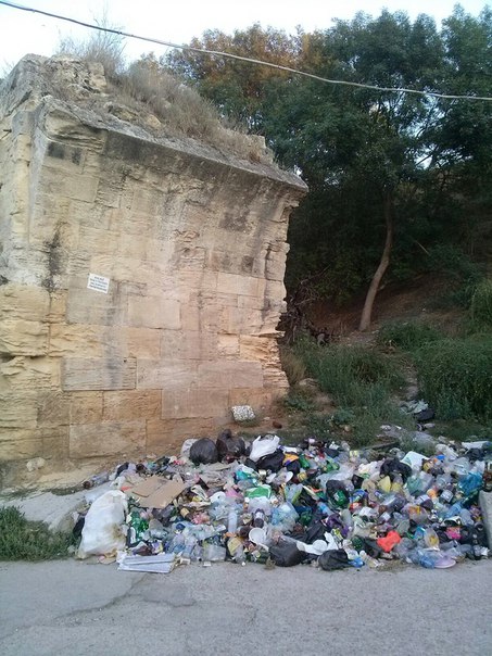 Свалка бытовых отходов прямо на обочине дороги, рядом с древним акведуком